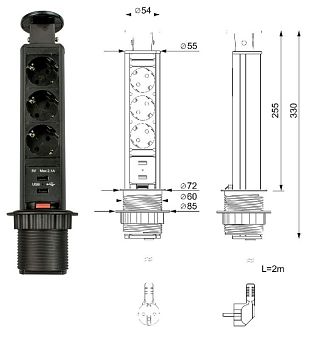 Блок розеток выдвижной круг. d60мм, 16А, 3 поста, 2USB, черн., провод 1,8м с вилкой