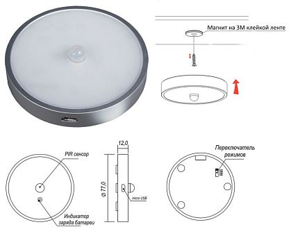 Светильник аккум. (LED) FIALIS, с датч. движ, 0,8Вт, 3000K, 50Лм, аккум. 1020мА/ч, серебр., магнит