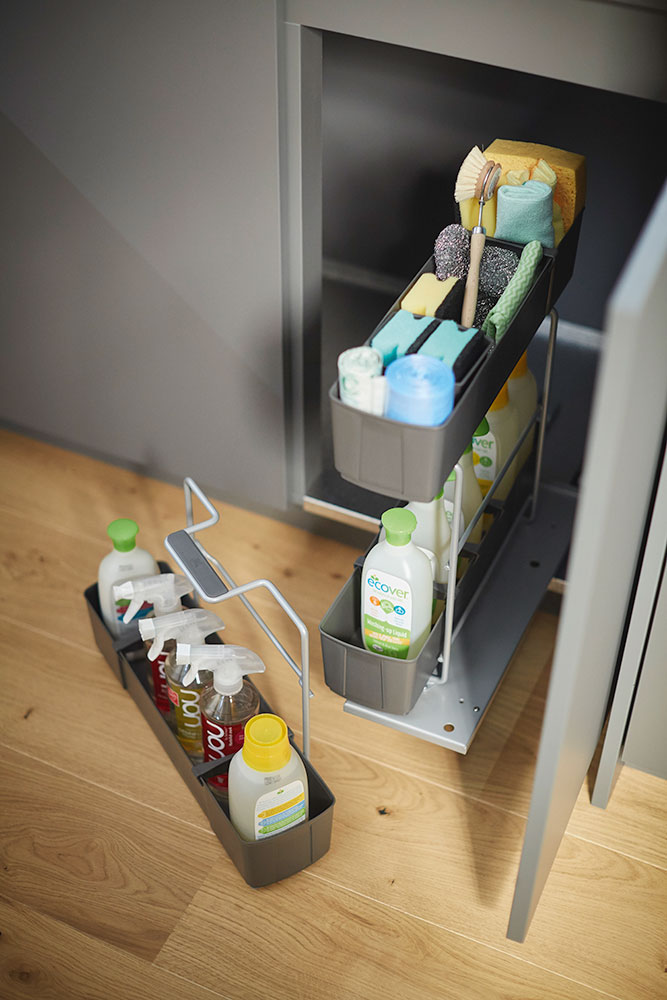 Выдвижной механизм с центральной рамой и регулируемыми полками для хранения различных средств для уборки дома. Функциональная боковая часть легко снимается и переносится в место уборки. Дно съемного модуля снабжено силиконовыми ножками, чтобы ставить его на любые поверхности, не повреждая их. Емкости Клининг Агента снабжены перемещаемыми делителями для надежной фиксации.