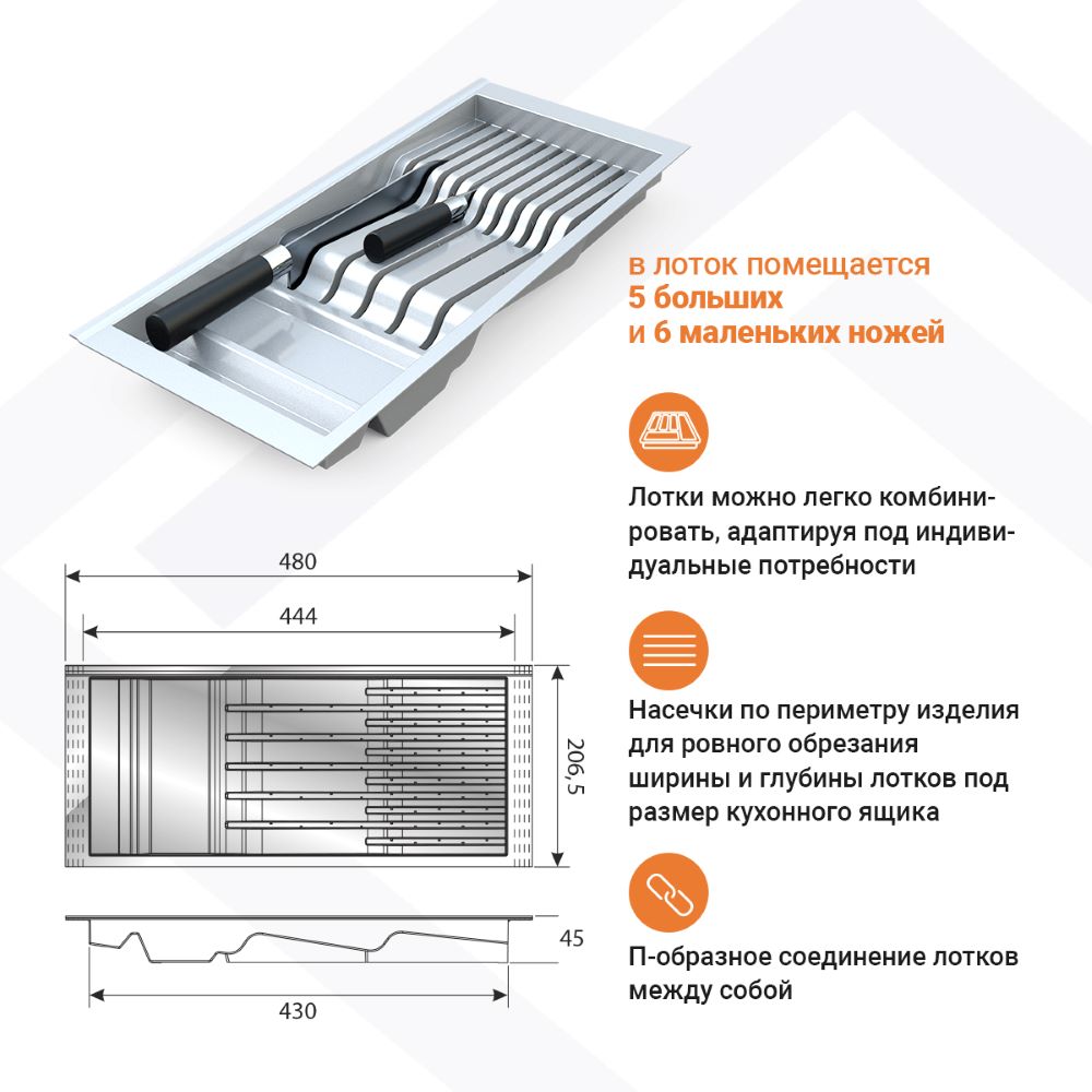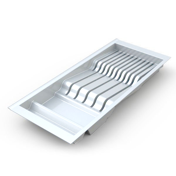 • Насечки по периметру изделия для ровного обрезания ширины и глубины лотков под размер кухонного ящика.