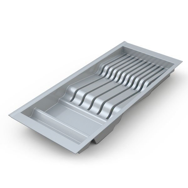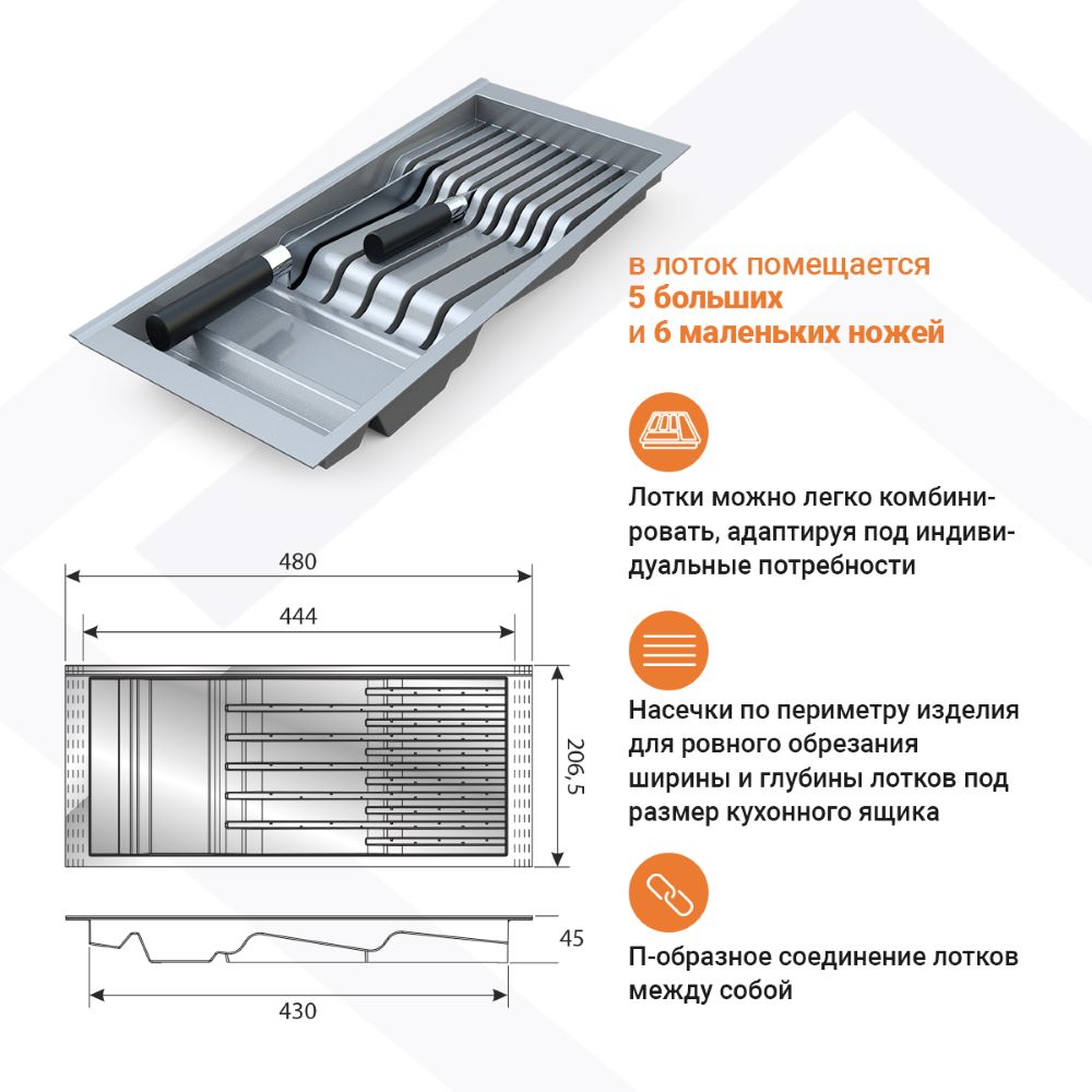 • Насечки по периметру изделия для ровного обрезания ширины и глубины лотков под размер кухонного ящика.