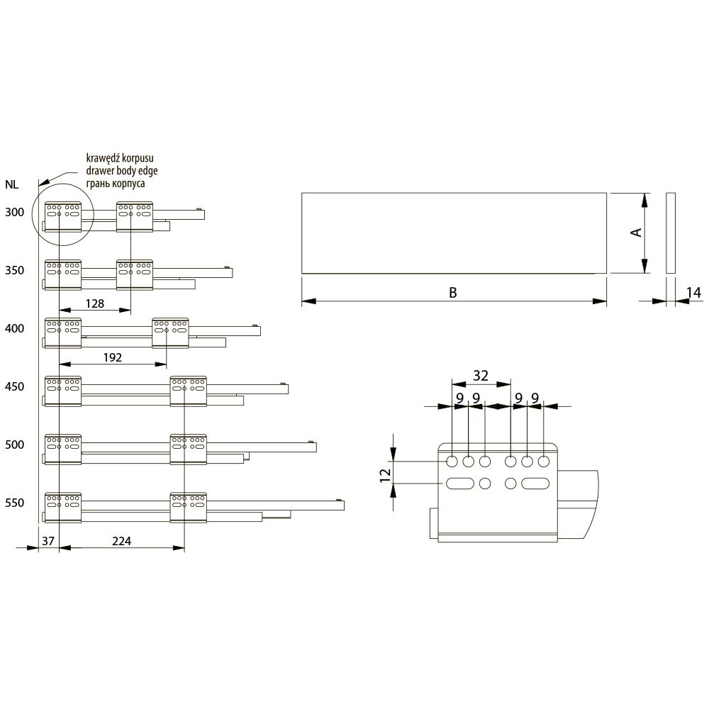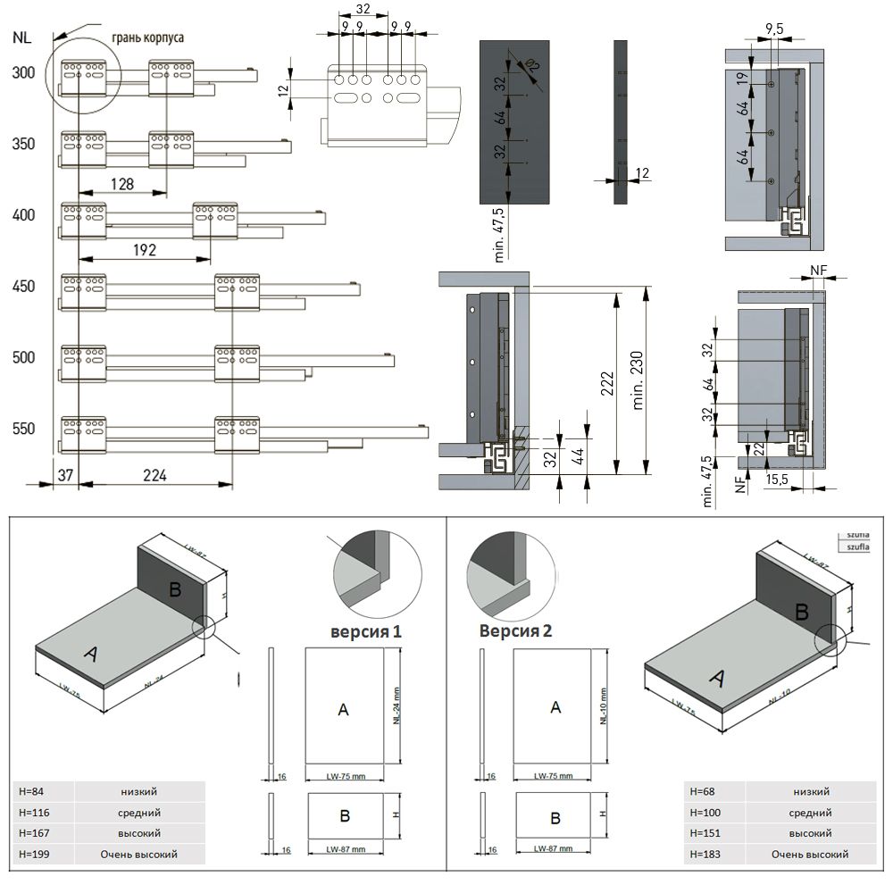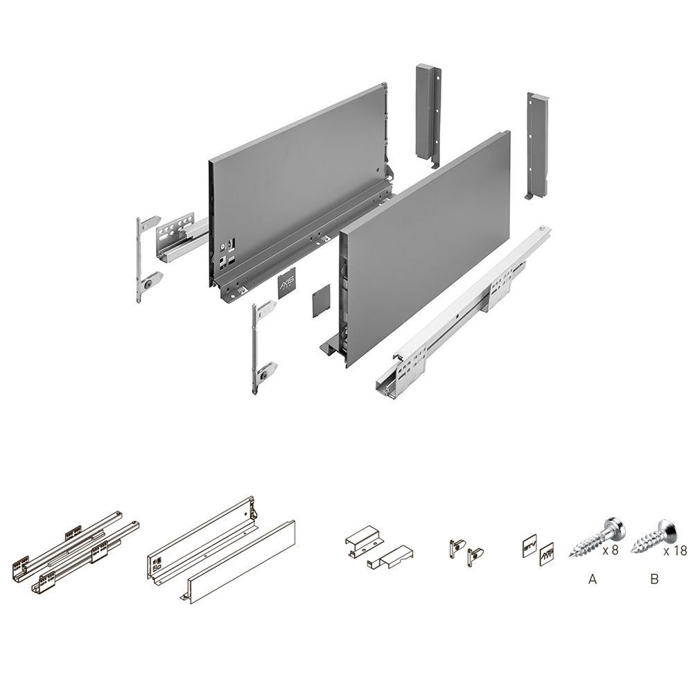 Выдвижной ящик GTV AXIS PRO L-450 мм, высокий H-200 мм, антрацит — это современная система выдвижения, разработанная с акцентом на функциональность и эстетичный дизайн. Ящик gtv идеально подходит для использования в кухонных гарнитурах и мебели для ванных комнат, обеспечивая максимальную эргономику и комфорт в эксплуатации. Комплектация: • Шариковые направляющие полновыкатные, левая и правая; • Боковые панели, левая и правая; • Крепление фасада для левой и правой боковой панели • Крепление задней стенки для левой и правой боковой панели • Заглушка для монтажных отверстий левой и правой боковой панели • Саморезы для монтажа. Преимущества: • Эстетичный дизайн с тонкими боковыми стенками (14 мм) и изысканным антрацитовым декором. • Максимальная вместимость ящика благодаря нижнему монтажу направляющих и минимальной толщине боковых панелей. • Регулировка фасада в вертикальной (+/- 2 мм) и горизонтальной (+/- 2 мм) плоскостях для идеального совпадения с общей мебелью.